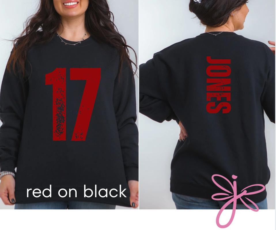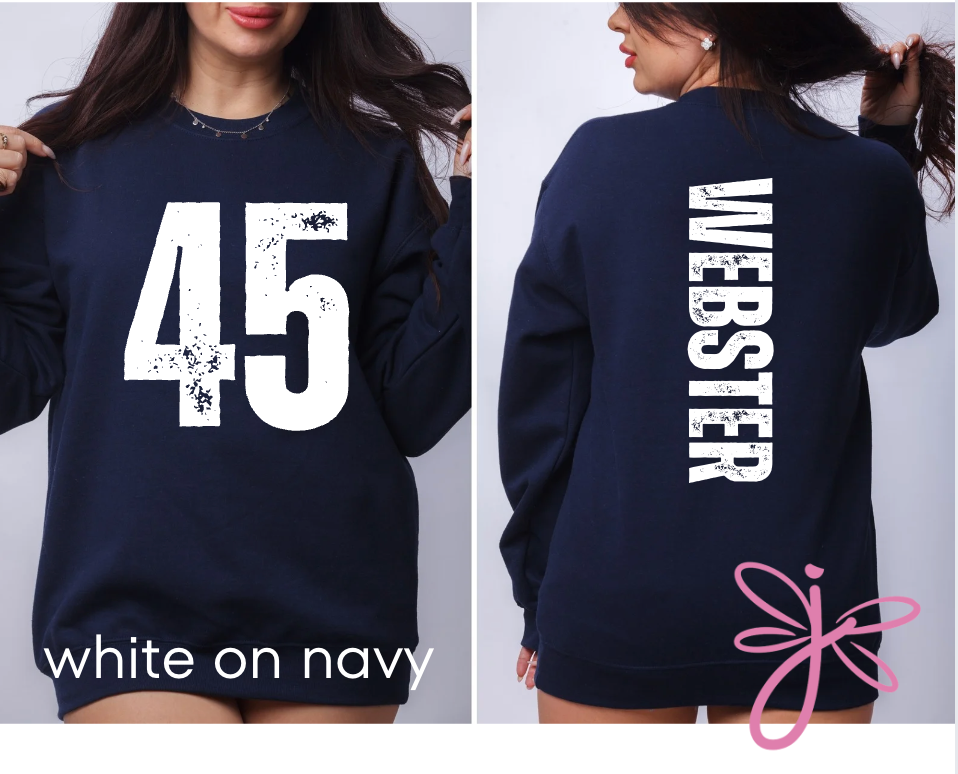 This custom sweatshirt is the perfect blend of retro and personal. Make it yours with our Personalized Player Number Sweatshirt, featuring a bold, oversized number on the front and a vertically placed name on the back—both in a vintage, weathered font for that effortlessly worn-in look. Choose shirt and font colors to match your team. Great for gifting, game days, or everyday wear—customize yours today!